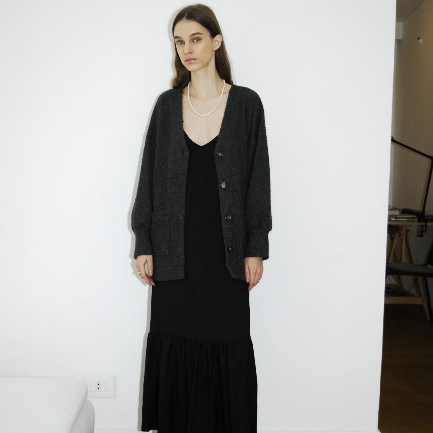 - Timeless grey cardigan with wool fabrication